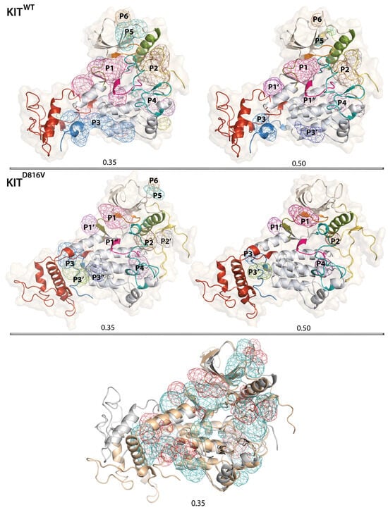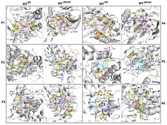 2.8. The KIT Cytoplasmic Domain Pockets Detected in the Native and Mutated Proteins