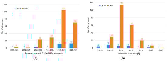 Distributions of CK2α and CK2α′ crystal structures based on data extracted from the PDB [,]. (a) Structures clustered into intervals of release years; (b) structures clustered into intervals of resolution.