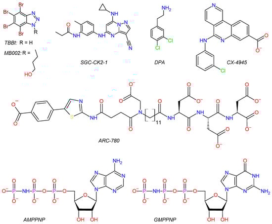 - Niefind, K.; Pütter, M.; Guerra, B.; Issinger, O.G.; Schomburg, D. GTP plus water mimic ATP in the active site of protein kinase CK2. Nat. Struct. Biol. 1999, 6, 1100–1103. [Google Scholar] [CrossRef] [PubMed]