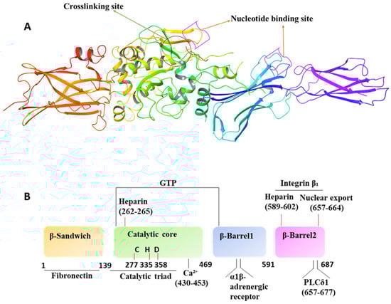 As a new member of the TG family with both calcium-dependent and calcium-independent activation, TG2 has emerged as a distinctive, highly complex, multifunctional isoform. This pleiotropic enzyme has a variety of localizations, including the cell membrane (both the inner and outer side) and the ECM, in addition to the cytosol and its organelles [10,48]. The miscellaneous functions of this protein are determined by its structural conformation. There are 687 amino acid residues in the TG2 protein’s primary structure. Four different structural domains make up the native 80 kDa protein: an N-terminal β-sandwich domain; a catalytic core domain made up of α-helices and β-sheets; a first barrel; and a C-terminal β-barrel [49,50] (Figure 1). These domains contain the functional binding sites of TG2. Specifically, a Fn binding site is present in the N-terminal β-sandwich domain. The substrate-binding pocket, the catalytic triad residues of cysteine, histidine, and aspartic acid, a binding site for GTP, binding sites for Ca2+, and a binding site for heparin are all found in the catalytic core. While the second β-barrel has interaction sites for phospholipase Cδ1 (PLCδ1), integrin, and heparin, the first β-barrel has a binding pocket for GTP and interactions with the α1B-adrenergic receptor [49,50].