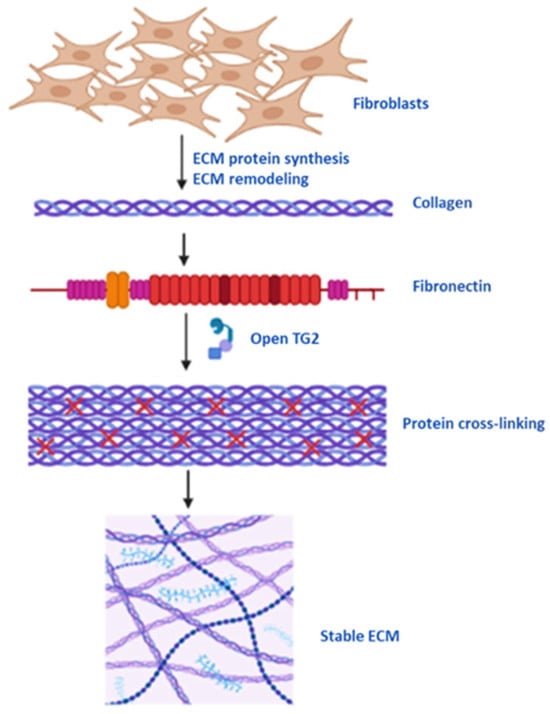 The majority of mammalian tissues contain the stress-inducible gene TG2, but only have transient activity in the ECM due to their vulnerability to oxidation [55,56]. However, constant upregulation of the TG2 gene over time may result in sustained activity of this protein. Due to its cross-linking activity, TG2 catalyzes Ca2+-dependent covalent modification of protein-bound glutamine through inter- or intramolecular cross-linking, deamidation and aminylation reactions [57,58]. Numerous intracellular and extracellular proteins have been identified as TG2 substrates for these processes [59]. In the ECM, TG2 initiates the cross-linking of structural proteins like collagen, Fn, fibrinogen, and laminin, creating a scaffold that is both stiffer and more stable [60] (Figure 2). The first step in the inter- and intramolecular cross-linking processes is the acylation of a protein-bound glutamine residue at the active cysteine site of TG2, which releases ammonia and creates a thioester intermediate between TG2 and glutamine. In the next transamidation step, isopeptide bond is generated by the attack of thioester intermediate by a primary amine such as lysine. Aminolation takes place when a primary amine substrate, such as polyamines, is present. This incorporation of the substrate into the target protein is accomplished via the production of a glutamyl-amine bond. Water functions as a nucleophile in the deamidation reaction, attacking the thioester intermediate and changing the glutamine residue into a glutamate residue [61].