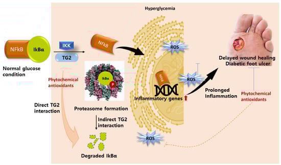 Normally, DFUs do not heal properly, and wound sites remain exposed to further injuries and microbial infections. Impaired wound healing makes the situation traumatic, with hospitalization and expensive treatments remaining the only options available for diabetic patients. Intriguingly, certain phytochemicals and synthetic drugs have been known to change TG2 expression in diseased conditions. Oleuropein, an extract of olive leaf, can promote the wound-healing process by modulating antioxidant capacity, fibrogenesis, and apoptotic process through TG and hydroxyproline expression that culminates in collagen deposition and re-epithelialization process [91]. Inflammation is an important event in the wound-healing process. Intracellular TG2 cross-linking during wound healing promotes inflammation through the activation of the noncanonical pathway of NFkB. In normal cellular conditions, NFkB remains inactive due to its tight association with IkBα. But under inflammatory conditions, IkBα is phosphorylated by IkB kinase (IKK) and degraded, thus releasing NFkB. Free NFkB is then translocated to the nucleus to activate downstream inflammatory genes. TG2 can either interact directly with IkBα, leading to its degradation via a proteasome-independent pathway, or indirectly polymerize IkBα, making its degradation feasible through proteasome, and thus activate NFkB during inflammation [92] (Figure 4). This knowledge can be translated into therapy for use in diabetic wound healing. Further, TG2 overexpression is known to cause the activation of TGF-β and its subsequent pathway in pulmonary fibrosis. TGF-β1-induced pulmonary fibrosis can be reduced through inhibition of TG2 and subsequent pathways by metformin [82]. TG2 is a dual-faced enzyme with contradictory roles in the instigation and progression of different diseases. TG2 overexpression exerts conflicting effects in different pathological conditions. For example, it plays an important role in cell proliferation and differentiation but mediates cell death and autophagy contingent on the kind of cell, apoptotic stimuli, and its subcellular location. Some pathological conditions, such as angiogenesis, fibroproliferative, and neurodegenerative diseases, are deteriorated as a result of TG2 overexpression, whereas in some conditions, such as diabetic wound healing, especially in diabetic foot ulcer, TG2 overexpression can be beneficial and used as a treatment strategy.