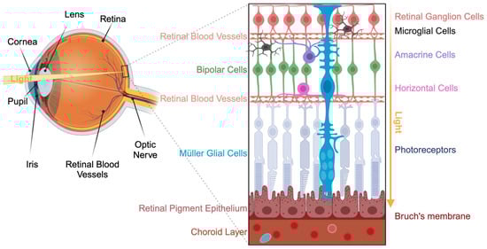 Structure of the eye. Schematic of the eye cup (left) and retina organization (right). Created with BioRender.com.