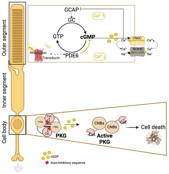 Schematic of the regulation of the phototransduction cascade, which depends on the interplay between cyclic guanosine-monophosphate (cGMP) and calcium ions (Ca2+). In the darkness, Ca2+ blocks the activation of retinal guanylyl cyclase (GC) by the guanylyl cyclase-activating protein (GCAP). GC produces cGMP, which opens the cyclic nucleotide-gated channel (CNGC), inducing Ca2+ influx. In light, phototransduction promotes the activation of cGMP-phosphodiesterase 6β (PDE6B) and the hydrolyses of cGMP, causing the CNGC to close, and the activation of cGMP synthesis. In conclusion, Ca2+ influx leads to the inhibition of cGMP via a regulatory feedback loop, keeping the levels of both cGMP and Ca2+ in physiological ranges and ensuring proper phototransduction. However, when this regulatory loop is unbalanced, resulting in increased Ca2+ influx or Ca2+ depletion, depending on the gene of the loop affected by a mutation, high levels of cGMP are found in the outer segment, leading to the overactivation of the cGMP-dependent protein kinase G (PKG) in the cell body and the death of the photoreceptors. However, the precise mechanism of the PKG in photoreceptor cell death is not well characterized, and future studies are necessary to identify which PKG substrates would be a putative target for future therapy development. Adapted from [9,10,11] and created with BioRender.com.