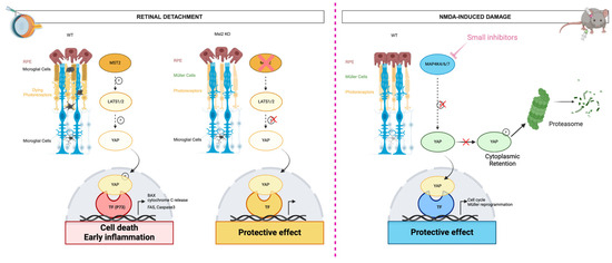 Schematic of the regulation of YAP co-transcription factor by (left) MAP4K4/6/7 after NMDA-induced damage of the retina and (right) MST2 after retinal detachment. The mammalian MAP4K4/6/7 induces the phosphorylation of YAP (P-YAP), leading to its cytoplasmic retention and degradation by the proteasome and, consequently, the death of the photoreceptors. When the mammalian MAP4K4/6/7 are inactivated by the injection of small inhibitors, YAP is not phosphorylated and can be translocated into the nucleus. The nucleus form of YAP can activate Müller cells’ reprogramming into retinal progenitors to repopulate the photoreceptors. In a similar manner, MST2 leads to the phosphorylation of YAP (P-YAP) and translocation of P-YAP to the nucleus after retinal detachment. Nucleus P-YAP can activate an early inflammatory response, as well as cell death mechanisms. Mst2 knock-out mice present neither translocation of P-YAP to the nucleus nor photoreceptor cell death after retinal detachment. Created with BioRender.com.