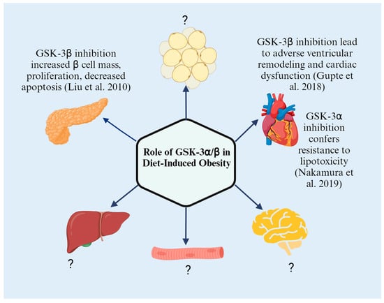 GSK-3 is a critical enzyme that has shed light into further understanding metabolic pathologies that underlie metabolic syndrome and related diseases (Figure 2 and Table 1). Genetically deleting or enzymatically inhibiting each ortholog has brought forth the distinct roles of the two GSK-3 in specific tissues and organs, such as heart, adipose, brain, skeletal muscle, and pancreas. While there are some studies (Figure 3) that have directly investigated the tissue-specific role of the two GSK-3s in diet-induced obesity models using HFD feeding, more studies are warranted to determine the specific role of the two orthologs in tissues such as adipose, skeletal, and liver wherein GSK-3 activity/expression has been shown to be dysregulated, predisposing individuals to obesity-associated pathologies including T2D. Additionally, while systemic GSK-3 inhibition is a crucial advancement in delineating the specific roles of the two GSK-3s in glucose metabolism under an HFD, homozygous genetic deletion is different from the level of inhibition seen with pharmacological agents. Therefore, future studies examining systemic heterozygous deletion in animal models are important for our understanding of the role of GSK-3s, which would mimic the level of inhibition generally seen with pharmacological agents.