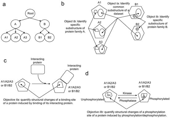 The objectives of this study. (a) An example of a hierarchical organization of protein structure dataset. A and B are two protein families. A1, A2 and A3 are the subfamilies of family A and B1 and B2 are the subfamilies of family B. (b) The objectives Ia and Ib are to identify the common and specific substructures of protein families. Common and specific substructures are illustrated. (c) The objective IIa is to quantify structural changes of a binding site of a protein induced by the binding of its interacting protein. The conformational changes of a binding site are illustrated. (d) The objective IIb is to quantify structural changes of a phosphorylation site of a protein induced by phosphorylation or dephosphorylation. The conformational changes of a phosphorylation site are illustrated.