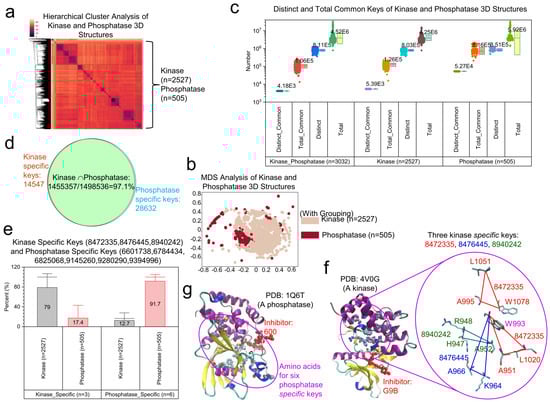 The TSR algorithm represents a protein 3D structure with all possible triangles, each of which is computed into an integer (a TSR key). This unique representation allows to determine a common substructure among kinases, among phosphatases and between kinases and phosphatase. Quantification of such a common substructure will provide insight into the hierarchical cluster analysis. In total, 5391, 52,714 and 4178 “Distinct_Common” triangles are identified for kinases, phosphatases and kinases/phosphates combined, respectively, when the number of occurrences of individual triangles (key frequency) is not counted (Figure 2c). If key frequencies are counted, 126,333, 815,511 and 105,677 “Total_Common” triangles on average are found for kinases, phosphatases and kinases/phosphates, respectively (Figure 2c). To estimate the percentage of “Distinct_Common” and “Total_Common” substructures, the numbers of “Distinct” and “Total” triangles are calculated for kinases, phosphatases and kinases/phosphates and then “Distinct_Common” is divided by “Distinct” and “Total_Common” is divided by “Total” (Figure 2c). In percentage terms, the calculation indicates that kinases share a 0.681% (“Distinct_Common” keys/“Distinct” keys: 5391/803,018) of TSR keys when not counting key frequency and a 3.13% of TSR keys (“Total_Common” keys/“Total” keys: 126,333/4,245,673) when key frequencies are counted. Phosphatases share higher average percentages of TSR keys given by Distinct_Common % (6.32% without counting key frequency) and Total_Common % (16.5% with counting key frequency). As expected, the average percentages of TSR keys given by Distinct_Common % (without counting key frequency: 0.523%) and Total_Common % (with counting key frequence: 2.55%) for the case of the whole dataset (kinases and phosphatases combined) are lower.