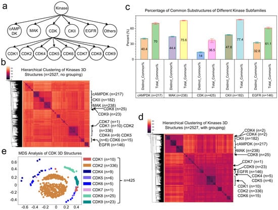 The kinase dataset contains 107 different types of kinases, with the numbers of kinases in each type ranging from a few to several hundred instances (Supplementary File S2). This study focuses on the cAMP dependent protein kinase (cAMPDK), mitogen-activated protein kinase (MAK or MAPK), cyclin dependent kinase (CDK), casein kinase II (CKII) and epidermal growth factor receptor (EGFR) families (Figure 3a), which have more instances in the dataset. There are ~20 members in the CDK family regulating the cell cycle, transcription and splicing []. The CDKs are in active or inactive forms depending on whether they associate with their partners, known as cyclins []. If they associate with cyclins, they will be in their active forms. If they do not associate with cyclins, they are in their inactive forms. We have identified eight members (CDK1–2 and 4–9) of CDKs from the PDB (Figure 3a). The hierarchical clustering shows that cAMPDK, MAK, CDK, CKII and EGFR have their individual clusters (Figure 3b) (Supplementary File S3), demonstrating their structural characteristics. However, not all the CDKs are in one single cluster as predicted. One large cluster and three small clusters are observed. The large cluster includes CDK1, CDK2, CDK4, CDK5 and CDK6 (Figure 3b). CDK7, CDK8 and CDK9 form their own three smaller clusters (Figure 3b). The clustering results can be partially interpreted by “Distinct_Common” and “Total_Common” keys. cAMPDK, MAK, CKII and EGFR families have their high structural similarity measured by percentage of “Distinct_Common” and “Total_Common” TSR keys (Figure 3c). In contrast, the CDK family has a relatively low structural similarity (Figure 3c). We hypothesized that applying amino acid grouping would increase the opportunity for more CDKs to be clustered together. However, the result shows the opposite effect (Figure 3d). The MDS analysis demonstrates that CDK2, CDK8 and CDK9 are well separated from other CDKs, suggesting the structural characteristics of these three CDKs. The rest of the CDKs have well-separated instances and overlapping instances (Figure 3e).