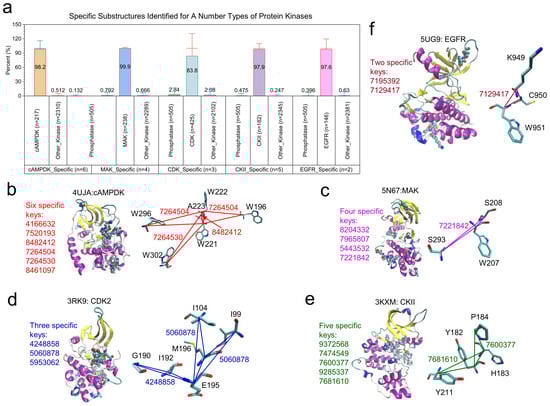 Specific TSR keys for CAMPK, MAK, CDK, CKII and EGFR are identified, quantified and presented. (a) The numbers of “Specific” TSR keys for each family, numbers of structures and average values are indicated. The error bars represent SDs. (b–f) Examples of “Specific” TSR keys are illustrated for cAMPDK (b), MAK (c), CDK (d), CKII (e) and EGFR (f). One of the longest connected specific key components is shown for each family. A connected component is defined as two or more triangles that share a joint vertex or a joint edge. This definition is applicable for other figures. PDB IDs and amino acids are labeled.