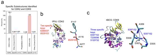 To completely interpret the clustering results, we next discuss distinctive structural characters seen in one family but not in other families in the kinase/phosphatase dataset. “Specific” TSR keys are identified for cAMPDK, MAK, CDK, CKII and EGFR families (Figure 4a). Representative examples are shown for cAMPDK (Figure 4b), MAK (Figure 4c), CDK (Figure 4d), CKII (Figure 4e) and EGFR (Figure 4f) families. High specificities are observed for the “Specific” keys of cAMPDK (98.2% vs. 0.512% other kinases and 0.132% of phosphatases), MAK (99.9% vs. 0.666% other kinases and 0.792% of phosphatases), CKII (97.9% vs. 0.247% other kinases and 0.475% of phosphatases) and EGFR (97.6% vs. 0.630% other kinases and 0.396% of phosphatases). Relatively low specificity is observed for the “Specific” TSR keys of CDK’s family (83.8% vs. 2.08% other kinases and 2.84% of phosphatases). CDK’s family contains eight members in the dataset. We further identify “Specific” keys for each member. Two and three “Specific” TSR keys are identified for CDK2 and CDK9, respectively (Figure 5a). The examples are shown in Figure 5b for CDK2 and Figure 5c for CDK9. The “Specific” keys combined with “Distinct_Common” and “Total_Common” keys explain the clustering results. In addition, the “Specific” keys represent unique substructures of that protein family or subfamily that provide the structural foundation for designing specific inhibitors.