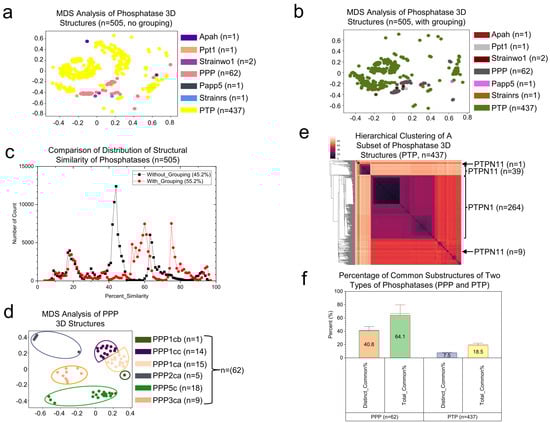 To understand phosphatase structural relationships, we first perform global structural clustering and MDS analyses. Seven different types of phosphatase structures are annotated in the dataset (Supplementary File S4). Because two types of phosphatases (phosphoprotein phosphatase (PPP) and protein tyrosine phosphatase (PTP) families) contain more instances than other types, we focus on the discussion around these two types of phosphatases. The TSR-based method cannot separate the PPP family from the PTP family and vice versa, either when not applying (Figure 6a) (Supplementary File S5) or when applying amino acid grouping (Figure 6b). It implies that the two phosphatase families likely share similar substructures, and each family may not have highly “Specific” TSR keys. As expected, applying amino acid grouping increases the structural similarity of phosphatases (Figure 6c).