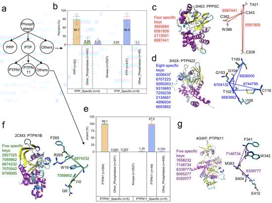 Hierarchical relationships of phosphatase families and subfamilies are demonstrated using the specific TSR keys. (a) A graph presentation showing the hierarchical relationships of phosphatase structures. (b) The numbers of “Specific” TSR keys for PPP and PTP families, numbers of structures and average values are indicated. The error bars represent SDs. (c,d) Examples of “Specific” TSR keys are illustrated for PPP (c) and PTP (d) families. One of the longest connected “Specific” key components is shown for PPP (c) and PTP (d) families. (e) The numbers of “Specific” TSR keys for PTPN1 and PTPN11 subfamilies, numbers of structures and average values are indicated. The error bars represent SDs. (f,g) Examples of specific TSR keys are illustrated for PTPN1 (f) and PTPN11 (g) families. One of the longest connected “Specific” key components is shown for PTPN1 (f) and PTPN11 (g) subfamilies.