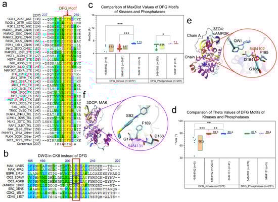 The DFG motif’s structural characteristics. (a,b) The amino acid sequence alignment of selected kinases using Vector NTI. The DFG (a) and DWG (a,b) motifs are highlighted. (c,d) MaxDist (c) and Theta (d) values of DFG motifs with different TSR numbers from kinases and phosphatases are calculated and presented. *** means p value < 0.001. ** means p value < 0.01. * means p value < 0.05. These are applicable for other figures. The numbers of kinases and phosphatases and structures in each TSR key category are shown. This is applicable to other figures. (e,f) Example of the DFG motifs of kinases with the TSR values of 5484102 (e) and 5484131 (f) are illustrated. PDB IDs, amino acids, inhibitors and keys are labeled.