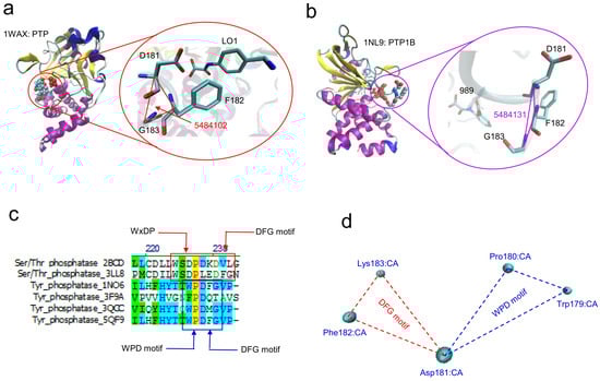 DFG and WPD motifs of phosphatases. (a,b) Example of the DFG motifs of phosphatases with the TSR values of 5484102 (a) and 5484131 (b) are illustrated. PDB IDs, amino acids, inhibitors and keys are labeled. (c) The sequence alignment shows the DFG and WPD motifs and WxDP sequence. (d) A DFG motif and a WPD motif share a common residue of Asp.