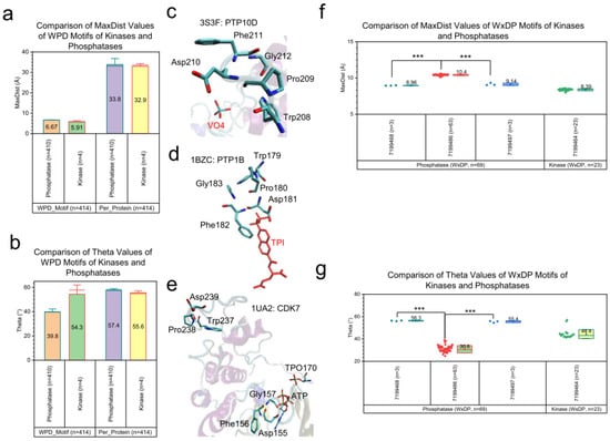 A WPD-loop is reported in phosphatases [,]. Asp in the motif of WPD functions as an acid and a base to directly participate in catalytic reaction [,]. This motivated us to study the WPD motif. Surprisingly, we find that the WPD motif and the DFG motif of tyrosine phosphatases share the common Asp residue (Figure 9c,d). Certain tyrosine phosphatases have a DMG motif (Figure 9c) instead of the DFG motif. It appears that certain serine/threonine phosphatases have a WxDP sequence. The proline residues from the WxDP sequence of serine/threonine phosphatases and the proline residues from the WPD motif of tyrosine phosphatases are aligned together (Figure 9c). Most of the phosphatases (410 out of 505 phosphatases) have a WPD motif (Supplementary File S8). Two types of kinases (CDK7 and BSK8) also have a WPD sequence. WPD motifs or sequences of phosphatases and kinases have different MaxDist (Figure 10a) and Theta (Figure 10b) values to those of all the combinations of triangles constituted by Trp, Pro and Asp residues. Two randomly selected WPD motifs of phosphatases (3S3F: PTP10D and 1BZC: PTP1B) are shown in Figure 10c,d. Both the WPD motifs share the Asp residue with their DFG motifs. Those WPD motifs have very close (i.e., a small difference in the associated Theta values) TSR keys (1BZC: 7199432 vs. 3S3F: 7199433), suggesting a similar geometry. In contrast, the DFG motifs have different conformations (1BZC: 5484102 vs. 3S3F: 5484131). For kinases, the WPD sequences and the DFG motifs are located at different places (Figure 10e) compared with those of phosphatases. The WxDP sequence is identified for 69 instances of phosphatases. Most of them are serine/threonine phosphatases and a few are tyrosine phosphatase. The WxDP sequences have their characteristic structures (Figure 10f,g) (t-test, p < 0.001). However, the biological functions of the WxDP sequences are not clear.