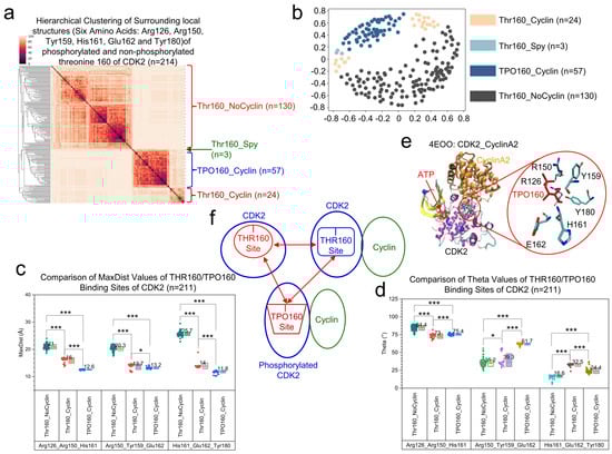 Six amino acids, including Arg126, Arg150, Tyr159, His161, Glu162 and Tyr180, are identified for the CDK2 phosphorylation site at Thr160. Both the hierarchical cluster (Figure 11a) and MDS (Figure 11b) analyses of these six amino acids clearly reveal these four groups. These results demonstrate structural characteristics of each group of CDK2 structures. To demonstrate the conformational changes induced by binding of cyclin and phosphorylation, we focus on the following three groups: Thr160 without an interacting protein, Thr160 with cyclin and TPO160 with cyclin. To show the conformational changes induced by binding of cyclin, we compare local structures between the group of Thr160 without an interacting protein and the group of Thr160 with cyclin. Three triangles—Arg126-Arg150-His161, Arg150-Tyr159-Glu162 and His161-Glu162-Tyr180—of the two groups have different MaxDist (Figure 11c) and Theta (Figure 11d) values (t-test, p < 0.05 or 0.001). To demonstrate the conformational changes upon the phosphorylation, we compare the group of Thr160 with cyclin to the group of TPO160 with cyclin. These two groups have different MaxDist and Theta values (Figure 11c,d) for the three triangles of Arg126-Arg150-His161, Arg150-Tyr159-Glu162 and His161-Glu162-Tyr180 (t-test, p < 0.05 or 0.001). One representative phosphorylation site is shown in Figure 11e. The TSR-based method uses MaxDist and Theta values of three triangles constituted from six amino acids in the phosphorylation site at Thr160 to quantify and define conformational changes induced by binding of cyclin to CDK2 or Thr160 phosphorylation. Such conformational changes are illustrated in Figure 11f.