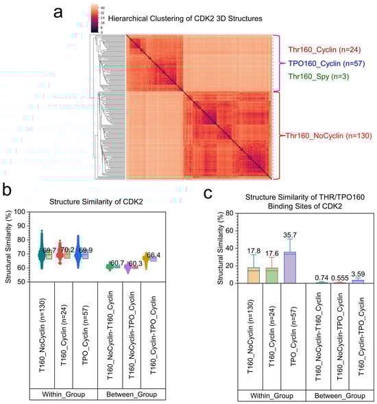 The CDK2 undergoes structural changes upon the binding of an interacting protein. (a) Hierarchical clustering of CDK2 structures with or without an interacting protein. Numbers of structures in each category are labeled. (b) The pairwise structural similarities of CDK2 within each category or between any two categories are shown. (c) The pairwise structural similarities of CDK2 phosphorylation site within each category or between any two categories are shown. (b,c) Means are labeled. Error bars indicate SDs.