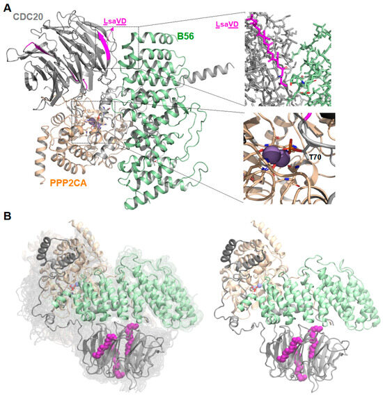 - Lee, S.J.; Rodriguez-Bravo, V.; Kim, H.; Datta, S.; Foley, E.A. The PP2AB56 phosphatase promotes the association of Cdc20 with APC/C in mitosis. J. Cell Sci. 2017, 130, 1760–1771. [Google Scholar] [CrossRef] [PubMed]
