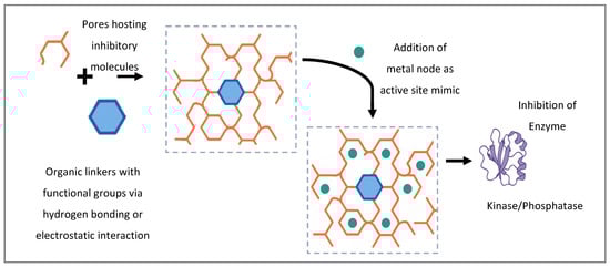 The combination of metal nodes and organic linkers forms a three-dimensional framework characterized by open channels or pores [44]. These pores allow enzymes or substrates to enter, with their size and shape directly influencing whether a protein can be hosted within the MOF or blocked at its surface. Additionally, in some MOF designs, exposed metal sites can chelate catalytic residues, phosphate groups, or cofactors associated with kinase or phosphatase active sites, providing a direct mode of inhibition [45].