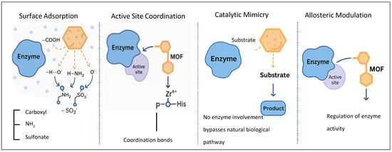 Schematic representation of four primary mechanisms by which metal–organic frameworks (MOFs) modulate enzymatic activity.