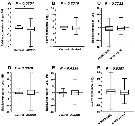 Comparative analysis of Aurora Kinases expressions. Legend: AURKA: Aurora kinase A; AURKB: Aurora kinase B; BM: Bone marrow; PB: Peripheral blood. Comparative analyses of AURKA and AURKB expression between the acute myeloid leukemia (AML) cohort and healthy controls. Boxplots display the median and minimum and maximum values of target gene expression. The Fold change of the samples was transformed on a logarithmic scale (Log2). The Y-axes of the graphs represent the relative expression scales of the target genes (range: −15 to 15; major tick interval: 5). The X-axes of the graphs are arranged in the sample groups. (A) AURKA expression in bone marrow (BM) samples compared to controls (Mann–Whitney test; p = 0.0254 *). (B) AURKA expression in peripheral blood (PB) samples (Mann–Whitney test; p = 0.2310). (C) Wilcoxon test results comparing BM and PB samples from AML patients for AURKA expression (p = 0.0778). (D) AURKB expression in BM samples compared to controls (Mann–Whitney test; p = 0.3078). (E) AURKB expression in PB samples (Mann–Whitney test; p = 0.6224). (F) Wilcoxon test results comparing BM and PB samples from AML patients for AURKB expression (p = 0.8357).