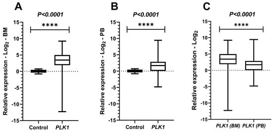 PLK1 expression was statistically significant both in BM (Mann–Whitney; p < 0.0001) and PB (Student’s t-test with Welch’s correction; p < 0.0001) when compared with the control group, indicating hyperexpression of this gene among individuals with AML. In the comparison between PB and BM from leukemic patients, using the paired t-test, a statistically significant difference was observed (p < 0.0001), with PLK1 expression in BM being higher than in PB (Figure 2).