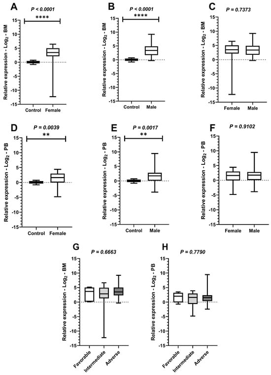 Comparison of PLK1 expression levels among study participants based on sex. Legend: Comparative analyses of Polo-like kinase 1 (PLK1) expression in relation to sex and risk stratification of study participants with acute myeloid leukemia (AML), with boxplots display the median and minimum and maximum values of target gene expression and Fold Changes transformed to Log2. The Y-axes of the graphs represent the relative expression scales of the target genes (range: −15 to 15; major tick interval: 5). The X-axes of the graphs are arranged in the sample groups. (A) Comparison of PLK1 expression between the control group and female patients in bone marrow (BM) samples (Mann–Whitney test; p < 0.0001 ****). (B) Comparison of PLK1 expression between the control group and male patients in BM samples (Student’s t-test with Welch’s correction; p < 0.0001 ****). (C) Comparison of PLK1 expression in BM samples between male and female patients (Mann–Whitney test; p = 0.7373). (D) Comparison of PLK1 expression between the control group and female patients in peripheral blood (PB) samples (Student’s t-test with Welch’s correction; p = 0.0039 **). (E) Comparison of PLK1 expression between the control group and male patients in PB samples (Mann–Whitney test; p = 0.0017 **). (F) Comparison of PLK1 expression in PB samples between male and female patients (Mann–Whitney test; p = 0.9192). (G) Comparison of PLK1 expression among favorable, intermediate, and adverse-risk groups in BM samples (Kruskal–Wallis test; p = 0.6763). (H) Comparison of PLK1 expression among favorable, intermediate, and adverse-risk groups in PB samples (Kruskal–Wallis test; p = 0.7790).
