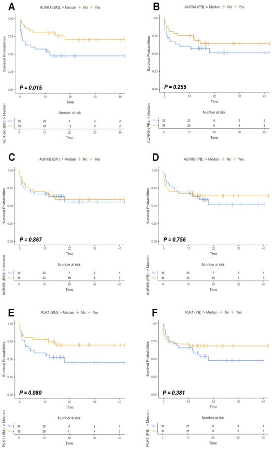 Initially, we evaluated the survival curves for AURKA expression in bone marrow and peripheral blood samples. Statistically significant differences were observed only in the bone marrow analysis (Log-rank: χ2 = 5.94; p = 0.015), while the peripheral blood analysis did not show significance (Log-rank: χ2 = 1.29; p = 0.255). For AURKB, neither BM nor PB analyses reached significance (Log-rank BM: χ2 = 0,0282; p = 0.867/Log-rank PB: χ2 = 0.0964; p = 0.756), in addition to the fact that there were overlapping curves in both analyses over time, indicating proportionally similar event rates between the groups. PLK1 survival curves in BM and PB analyses also showed no statistical significance, with p-values of 0.080 (Log-rank: χ2 = 3.07) and 0.381 (Log-rank: χ2 = 0.767), respectively.