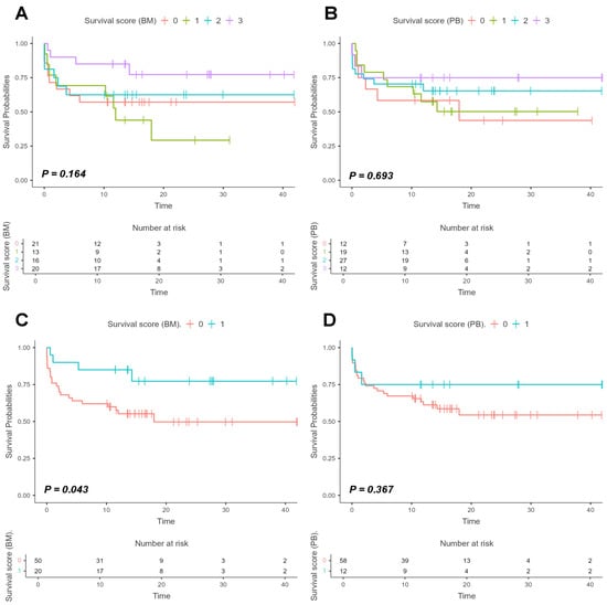 Survival curves based on the scoring system derived from AURKA, AURKB, and PLK1 expression in bone marrow and peripheral blood samples. Legend: Survival curves based on a score system to assess patient survival according to the expression of target genes (AURKA, AURKB and PLK1) in bone marrow (BM) and peripheral blood (PB) samples and with expression values normalized on logarithmic scales (Log2). The curves were estimated using the Kaplan–Meier method, with the difference between groups evaluated by Log-rank test, and the respective p-values indicated in each graph. Panels (A,B) show four colored lines representing patient stratification by score system, with p-values of 0.164 and 0.693, respectively. The red line represents Group 0, which are patients without expression of any of the three target genes above the median; the green line represents Group 1, patients with expression of one gene above the median; the blue line represents Group 2, patients with expression of two genes above the median; and the purple line represents Group 3, patients with expression of all three target genes above the median. Panels (C,D) show patient stratification into two groups: the red line represents Group 0, which are patients without the expression of all three target genes above the median, while the blue line represents Group 1, patients with expression of all three target genes above the median. Analysis of BM samples yielded p = 0.043, whereas analysis of PB samples yielded p = 0.367.