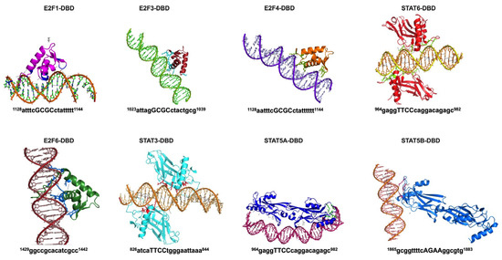 To validate the direct binding of TFs, we modeled each TF-promoter DNA interaction in AlphaFold 3.0 (AF3) [27] (Figure 2). AF3 can model biomolecular interactions, such as protein–protein, protein–DNA, protein–RNA, and protein–ligand interactions with high accuracy. The interaction of residues present in the DNA-binding domain of TF and DNA was identified by AF3 for STAT3, STAT5A, STAT5B, STAT6, E2F1, E2F3, E2F4, and E2F6. Notably, the promoter regions were found to be similar to the DNA motifs identified by Genomatix/MatInspector (Figure 2, Table S3), suggesting that these sites may be putative binding sites for these transcription factors in the STK35L1 promoter. The DNA binding motif identified by AF3 for E2F6 was 10 bp upstream of the motif recognized by the Genomatix/MatInspector (Figure 2, Table S3). The DNA binding regions of other transcription factors E2F2, FOXA1, FOXA2, FOXG1, TCF3, MYBL2, and SOX2 (Figure S1) were uniquely identified by the AlphaFold models. No interaction of SMAD3 was observed with the STK35L1 promoter, suggesting that it may interact with the STK35L1 promoter indirectly.