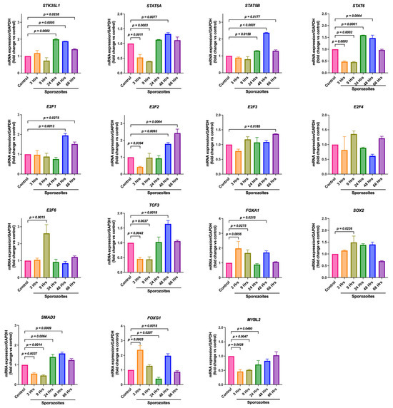 We asked whether the selected TFs are differentially regulated during the infection of Plasmodium sporozoites in HepG2 cells. The expression of these TFs in non-infected (control) and infected cells was measured by qPCR at different time points (3 h, 9 h, 24 h, 48 h, and 66 h) after infection. Among all the transcription factors studied, it was found that STAT5A, STAT6, E2F2, TCF3, and SMAD3 were significantly downregulated during early sporozoite infection (at 3 h and 9 h). However, these TFs were significantly upregulated at 48 h of sporozoite infection (Figure 4). SOX2 and E2F6 were found to be substantially upregulated at 9 h of sporozoite infection (Figure 4). Interestingly, the FOX family members, FOXA1 and FOXG1, were significantly upregulated during the initial sporozoite infection (3 h) and then downregulated at 24 h but recovered by 48 h of sporozoite infection (Figure 4). E2F1 and STAT5B were found to be upregulated at 48 h of sporozoite infection (Figure 4). Interestingly, MYBL2 showed significant downregulation during the sporozoite infection, suggesting its negative correlation with the infection. No significant changes were observed in the expression of E2F3 until 48 h after sporozoite infection; however, it was significantly upregulated at 66 h (Figure 4). No significant changes were observed in the expression of E2F4 at any time point of sporozoite infection (Figure 4). Collectively, these data suggest that, except for E2F4, all the TFs (STAT5A, STAT5B, STAT6, E2F1, E2F2, E2F3, E2F6, TCF3, FOXA1, FOXG1, SMAD3, and SOX2) were differentially regulated during the sporozoite infection and might play a crucial role during the liver stage of malaria.