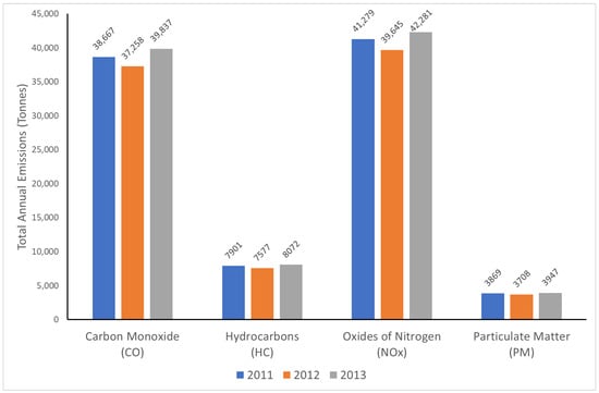 Total annual emissions of CO, HC, NOx and PM from agricultural machinery operated in Poland 2011–2013, adapted from [33].