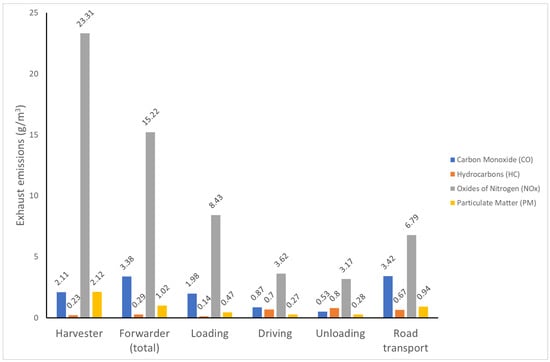 Exhaust emissions for individual timber extraction stages for 1 m3 of timber adapted from [59].