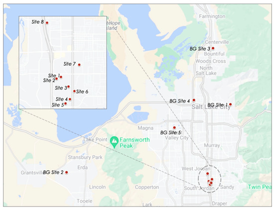 Map showing where the canister-based measurements were taken across Utah’s Salt Lake Valley. There are 8 sampling sites near the medical sterilization facility (see blown up image) and 5 background site locations (Google Maps, 2022 [9]).
