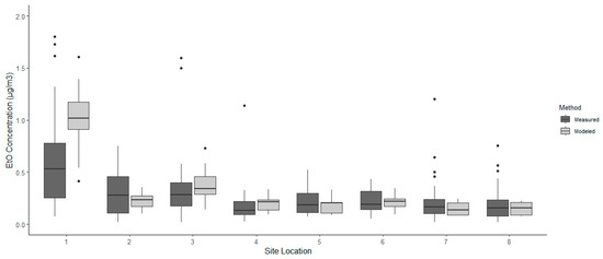 The Wilcoxon signed-Ranked test results comparing the measured and modeling concentrations are outlined in Table 2. The results indicated that six of the eight sample locations surrounding the sterilization facility significantly differed when comparing dispersion-modeled estimates of ambient EtO to canister-based measurements. Modeled estimates at sites 1, 3, and 4 were statistically higher than the canister-based measurements, whereas estimated ambient EtO at sites 2, 5, and 7 were statistically lower than the canister-based measurements. Sites 6 and 8 showed no statistical difference. Figure 2 mirrors these findings and visually shows that neither method, modeled or measured ambient EtO, was more conservative than the other. A conservative method would have a lower median concentration of ambient EtO between the modeled and measured boxplots for each of the eight sites. The median concentration is lower at sites 1, 3, and 4 when plotted next to the median of the measured method, whereas sites 2, 5, and 7 are higher than the modeled median concentration. The dispersion modeling estimation method appears to have been the conservative collection method for three sites, especially at site 1. However, canister-based measurements were more conservative at the other three significantly different sites. Therefore, the results do not clearly indicate whether one method is consistently more or less conservative than the other. This suggests that the calculation of a correction factor to relate the modeled and measured concentrations consistently is not possible. Figure 2 does not include an extreme outlier measured from the canister-based collection method at site 6, reported at 7.0 μg/m3. Although the value was removed from Figure 2, it was included in the analysis. The difference seen between the modeled and measured median at site 6 may have been prevented from producing a statistically significant result because of outliers in the data. The last interpretation from Figure 2 was that ambient EtO concentrations are expected to be higher closer to the sterilization facility, as seen at site 1, and gradually decrease as distance increases away from the source.