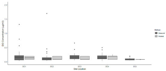 AERMOD dispersion modeling does not include contributions from background sources of ambient EtO in its estimates; it only models the emissions from the point source. The background sites were used to compute a summer and winter background concentration using a mean-of-the-medians method. The median EtO concentration was determined for each background site (sites B1–B5) for both seasons (summer and winter). Then, the five winter and four summer background site medians were averaged together to establish a single EtO background concentration value for winter and summer, respectively. The corresponding seasonal background value in μg/m3 was added to AERMOD’s estimated concentrations. Rather than using a mean-of-the-means method, this procedure removed the significant bias that a few measurement outliers would have on the data/analysis and, in essence, established values closer to the central tendency of the true background value. A Wilcoxon signed-ranked test for paired, non-parametric data was used to compare the modeled EtO estimates to the canister-based EtO measurements for each of the eight sites. RStudio was used for all statistical analyses [10].