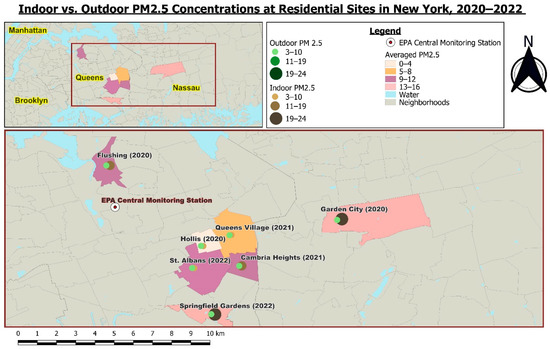 This study was conducted at seven (7) residential homes in New York (Figure 1) using two AirBeam2 concurrently: one for indoor and another for outdoor sampling at each location. “The phases of the pandemic: during and after the lockdown are arranged temporally (days and months), seasonally (winter and fall), by sampling duration and site description for both indoor and outdoor PM2.5 sampling at each home (Table 1). In New York, the government response to the COVID-19 pandemic began with a full emergency lockdown in March 2020, followed by less-stringent lockdown and reopening phases, which we have put into five phases. During the emergency lockdown or Phase I of the pandemic (March through September 2020), no measurements were taken. Therefore, Phase I is not shown on the table. PM2.5 sampling for this study commenced during Phase II of the lockdown in fall 2020 (October and November), then in phase III of the lockdown in winter 2021 (February), followed by a reopening or Phase IV in fall 2022 (September through November)”. PM2.5 samples were taken indoors and outdoors for approximately 2–6 h during and after the COVID-19 pandemic lockdown and reopening phases; however, the time spent on a daily basis in the different microenvironments indoors varied from home to home. Indoor samples were collected in the living room at Home 1 in Queens Village; the kitchen of Home 2 in Cambria Heights; the living room of Home 3 in Flushing; the living room and basement of Home 4 in Hollis; the kitchens of Home 5 in Garden City, Home 6 in Springfield Gardens, and Home 7 in St. Albans. After each sampling session, the data were downloaded, and STATA version 15 was used to perform statistical analysis. Daily concentrations of ambient PM2.5 levels in this study were compared to those obtained from the EPA regulatory/central monitoring station in Queens, NY, during the same period [21].