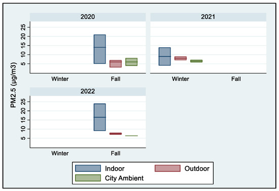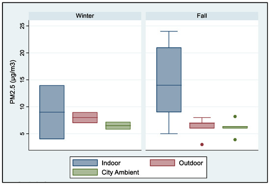 Indoor PM2.5 levels were consistently high in both winter and fall, even though they were not statistically significant (p = 0.42); indoor PM2.5 levels were higher than sampled outdoor and city ambient levels in the winter (Table 3). Additionally, indoor PM2.5 levels in the fall were higher than outdoor and city ambient levels with values of 14.6 µg/m3, 6.2 µg/m3, and 6.16 µg/m3, respectively. Overall, indoor PM2.5 levels during the fall were significantly greater than indoor winter levels (Figure 3). Indoor PM2.5 levels in the fall were also higher than the measured outdoor and city ambient levels. These results are further discussed in Section 4.3 and Section 4.4.