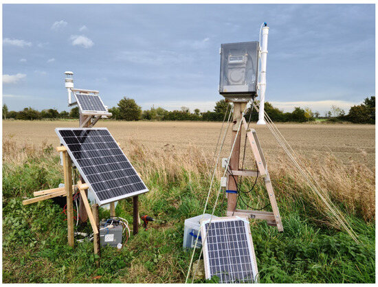 Similarly, for the active sampling of NH3 and the sampling of SIA, CEH DELTA® II (DEnuder for Long-Term Atmospheric) (UK Centre for Ecology & Hydrology, Oxfordshire, UK) samplers were chosen. These samplers required electricity to run. Therefore, a sustainable power station was built on Site 1 to facilitate a DELTA II sampler. Environmental factors such as air and soil temperature, and precipitation, which affect these emissions and consequent aerosol formation, were also monitored to determine the capacity of the effect. Additionally, a MetOne weather station was also set up at Site 1, measuring temperature, relative humidity (RH), wind direction (WD), wind speed (WS), and barometric pressure (BP) (Figure 1). HOBOware© v3.7.2 rain gauges and additional temperature probes were also set up at Sites 1 and 2, which were run using software designed for HOBOware© (HOBO, Bourne, MA, USA).