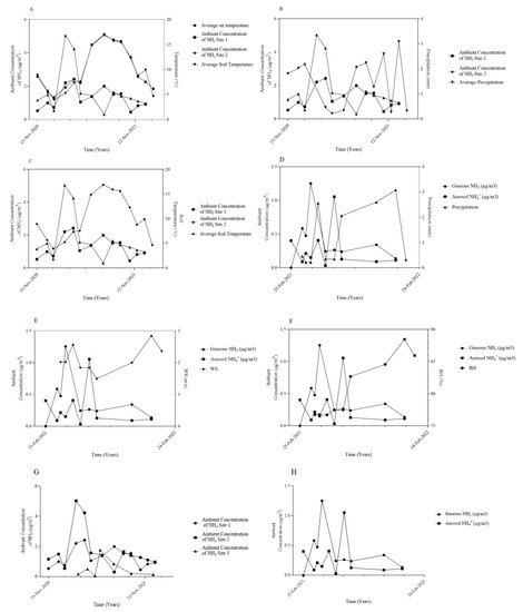 Temporal variation cross-examined with atmospheric NH3 and aerosol NH4+ emissions: (A) average air and soil temperature and NH3; (B) precipitation (average of both sites) and NH3; (C) average air and soil temperature and NH3 and aerosol NH4+; (D) precipitation and NH3 and aerosol NH4+ at Site 1; (E) wind speed (WS) and NH3 and aerosol NH4+ at Site 1; (F) relative humidity (RH) NH3 and aerosol NH4+ at Site 1; (G) measured concentrations of gaseous atmospheric NH3 at all sites; (H) measured concentrations of gaseous atmospheric NH3 and aerosol NH4+.