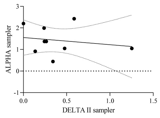 The average concentrations measured during the monitoring period were 0.39 μg m−3 and 0.27 μg m−3 gaseous ambient atmospheric NH3 and aerosol NH4+, respectively, using DELTA II samplers (Table 2). The maximum concentrations measured for gaseous NH3 were 1.25 μg m−3, recorded during the period of April–May 2021, and 1.05 μg m−3 aerosol NH4+, recorded during the period of June–July 2021 (Figure 2H). The concentrations of gaseous NH3 measured using the ALPHA samplers were higher compared to concentrations measured by DELTA II sampler (Figure 3).