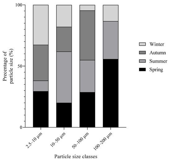 A filter from each season (winter, spring, summer, autumn) during the monitoring period of November 2020–January 2022 was imaged. Size distribution analysis was performed to determine the size distribution of aerosols representative of each season (Figure 4). The PPD and average particle size for each season were also determined (Table 3).