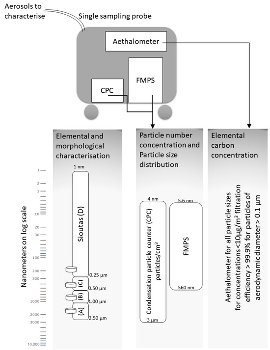 This observational study characterized the particle number concentration (PNC) and the median particle size (dmn50 in nanometers) of airport aerosols at two levels: (i) specific engine emissions (also known as emission sources and including aircraft and ground vehicles or generators) and (ii) aerosols at a medium-haul workstation area. Aerosol sampling for (i) and (ii) took place in October 2018 at Paris-CDG airport, France, and was performed using trolley-mounted devices that simultaneously analyzed the aerosols entering a single-probe trolley (Figure 1). Device limitations in terms of the particle size ranges they can treat are indicated by box spans over the nanometer log scale (indicated on the left-hand side of the graphic). Devices located on a trolley for simultaneous mobile assessments included a condensation particle counter (CPC), a fast mobility particle sizer spectrometer (FMPS), and an aethelometer (all on the same sampling probe). A compact membrane sampling device (i.e., Sioutas®, SKC, Eighty Four, PA, USA) was useful to characterize the source emissions directly from engines as well as for the sampling at the medium-haul work area. The Sioutas® device collects particles onto four different membranes according to the size.