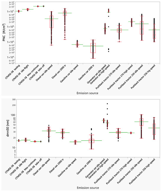 Box plots in red and average straight lines in green of the particle number concentration (PNC) and the median particle size (dmn50) for the engine exhausts studied (i.e., Aircraft engine CFM56-5B, diesel van, gasoline car, generator set, Pushback tractor 270, and Pushback tractor 256) as a function of the engine rpms.
