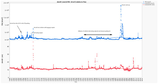 Measurements were taken at the medium-haul area during the “hub” period, a high activity period with incoming travelers gathered for afternoon long-haul flights. The period included the plane’s arrival (11:07 a.m.), passenger and luggage disembarkation, maintenance tasks on and around the aircraft before new passengers and luggage board, and ultimately the departure of the aircraft (12:05 p.m.). Figure 3 focuses on the PNC and dmn50 of aerosols during the parking of an A321 Airbus aircraft at the F30 parking.