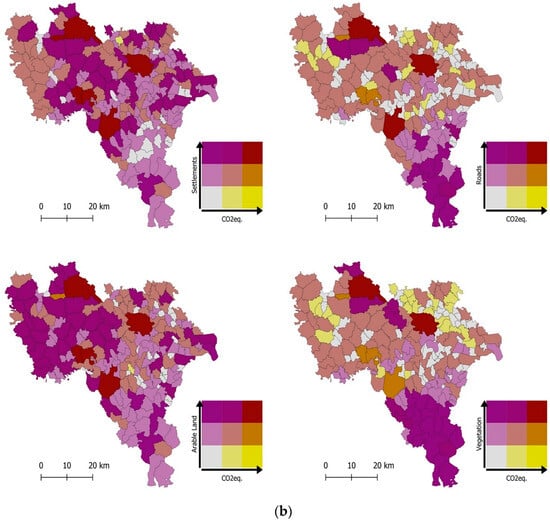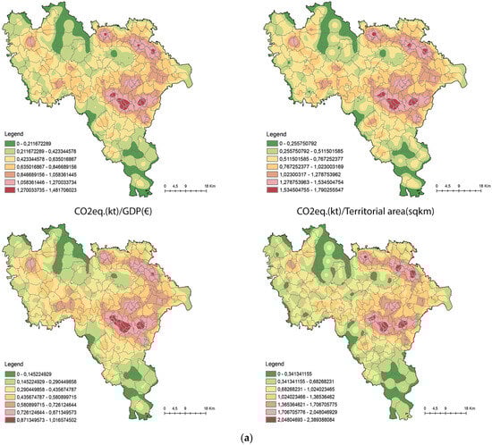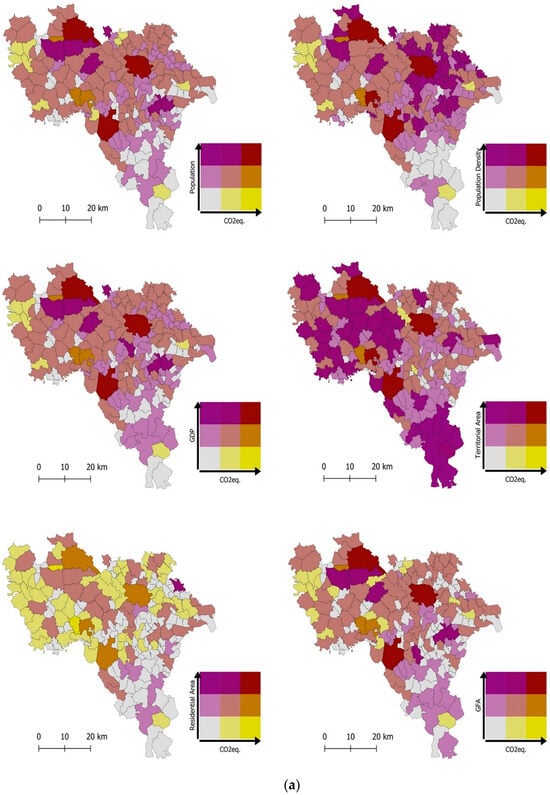 Figure 3a,b contain information on the spatial distribution of CO2 equivalent values compared to other demographic and territorial indicators, illustrating how these values are grouped or distributed within the province.