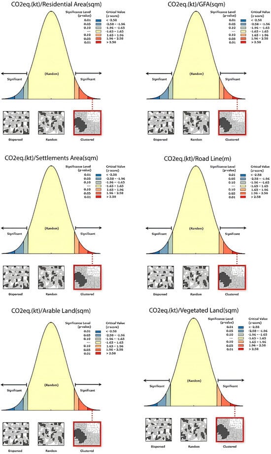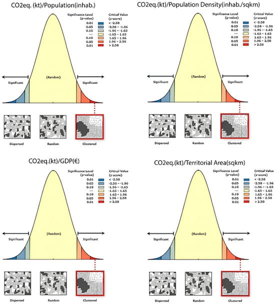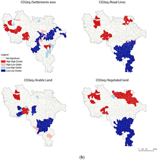 - High–High Cluster: A cluster of areas with a high CO2 equivalent value and high values of other demographic or territorial indicators. This means that the areas in this cluster have relatively high values for both variables.