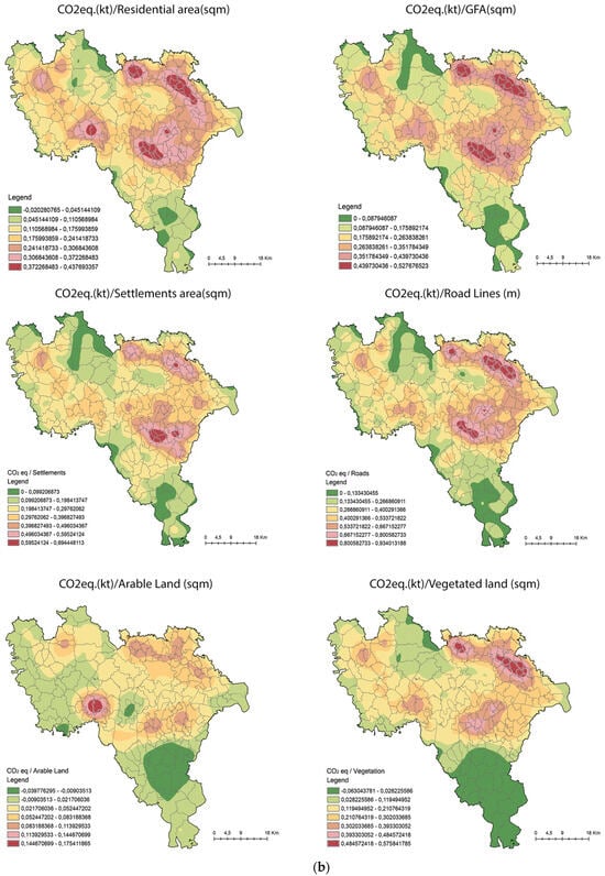 (a) Kernel density map ratio between CO2eq. and population–population density–GDP–territorial area–residential area–GFA. (b) Kernell density map ratio between CO2eq. and settlements area–road lines–arable land–vegetated land.