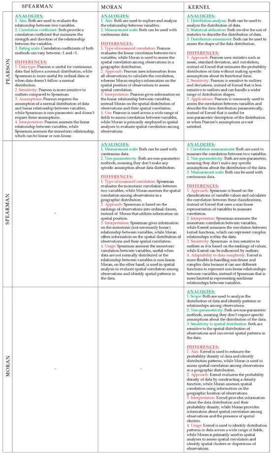 Analogies and differences between Pearson’s correlation, Spearman’s rank correlation, Moran’s spatial autocorrelation, and Kernel density.